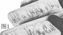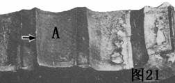 圖21是在齒輪的若干齒上,由于重復(fù)的重載荷引起的斷折的情況。標有“A”字的齒看來是由于疲勞裂紋首先折斷的(注意光滑、似夭鵝絨般的地帶)。