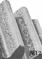 圖11中的麻點在螺旋面的外端(此圖中齒輪的右邊)開始,原因是中心線稍有失調(diào),麻點慢慢地向齒的中部進展最后停止進展,表面開始拋光,表示載荷沿齒面分配變得更均勻了.這種麻點是無害的。