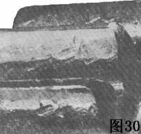 圖30所示為中等硬度齒輪由于碾壓和敲擊作用而造成的表面變形。這個齒輪很可能是受到超載荷,并且在有了初步的損傷之后長期使用,造成表面敲壞。